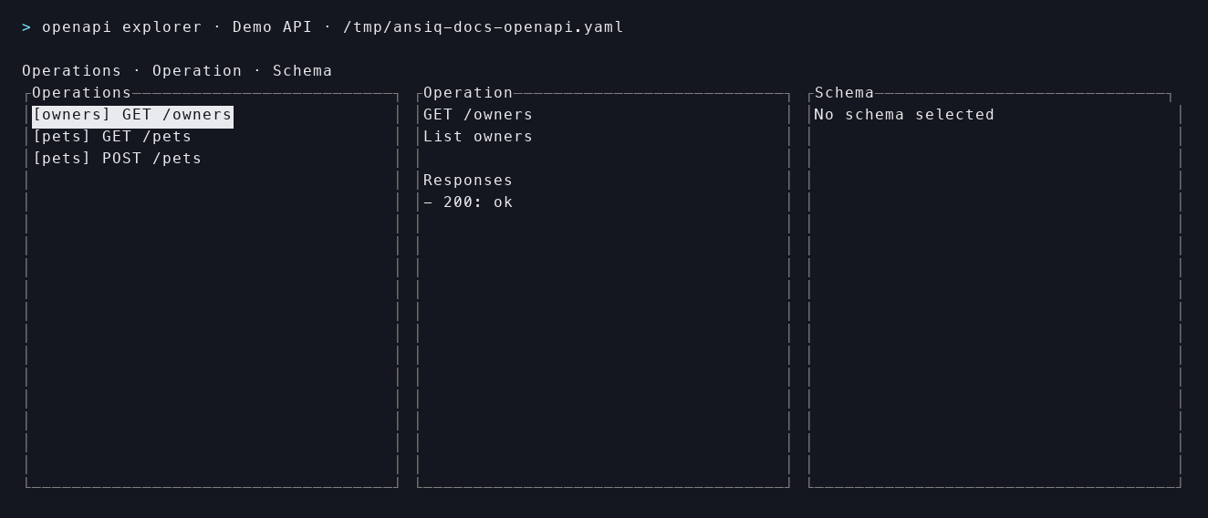 cargo run -p ansiq-examples --example openapi_explorer -- --input /path/to/spec.yamlYou can also pass a remote URL: