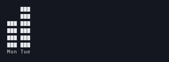 WidgetsBarChartBarChart BarChart displays labeled bars. BarChartTerminal preview of BarChart Smallest example let chart = BarChart::new() .bar("Mon", 12) .bar("Tue", 18) .max(20) .build(); Key builder methods .bar(...), .bars(...) .max(...) .bar_width(...) Last updated on April 7, 2026SparklineChart